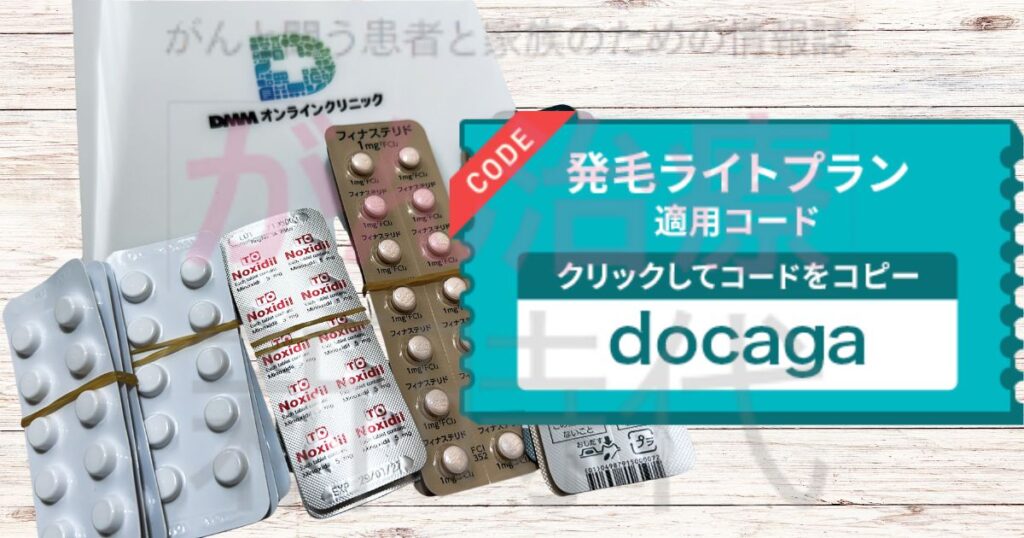 ※2) 発毛ライトプラン(フィナステリド1mg+ミノキシジル5mg)をらくらく定期便12ヶ月の予約ページでクーポン欄に「docaga」を入力した場合に適用