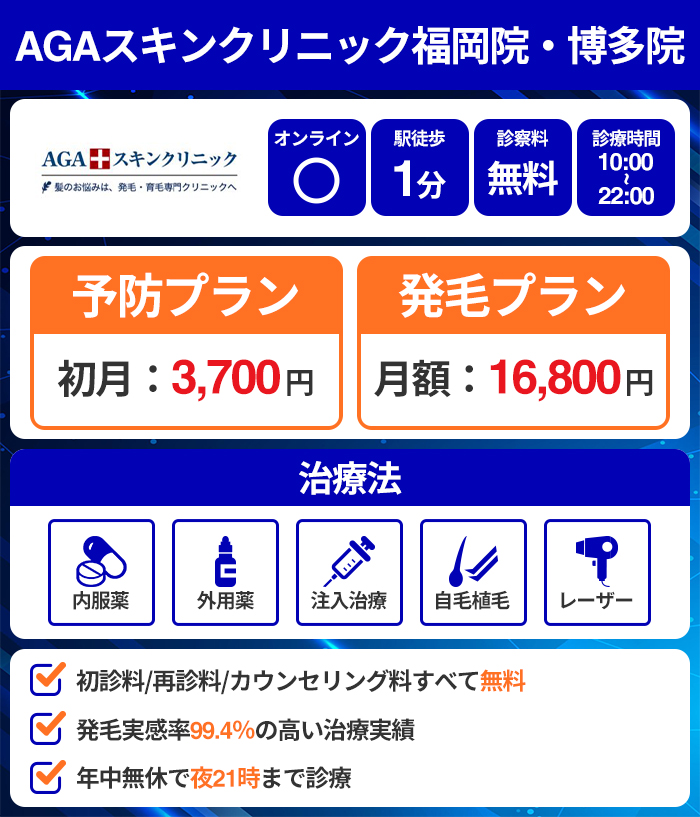 | Dr.AGAクリニック 福岡博多院 | 予防:3,190円 /月 発毛:9,790円 /月 【初月:980円】 | 無料 |