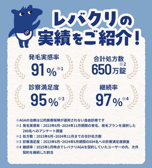 レバクリのAGA治療では発毛実感率91%(※1)に加え継続率97%(※2)、診察満足度95%(※3)と豊富な実績が特徴です。