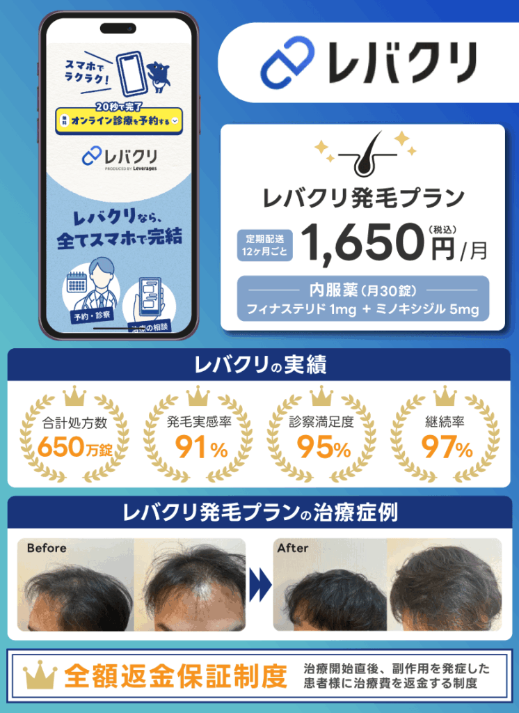 ※4)レバクリ発毛プラン(フィナステリド内服1mg+ミノキシジル内服5mgの合剤で合計30錠)を定期配送12か月分利用で1ヶ月あたりの金額(合計19,800円)。別途送料550~1,100円(税込)かかります。
